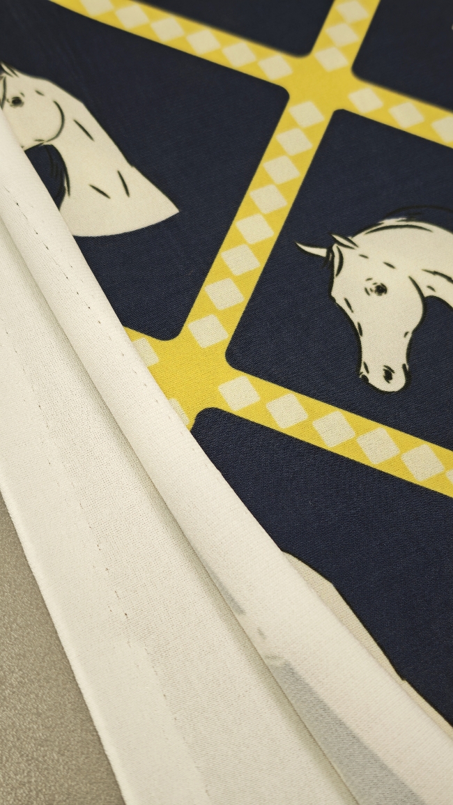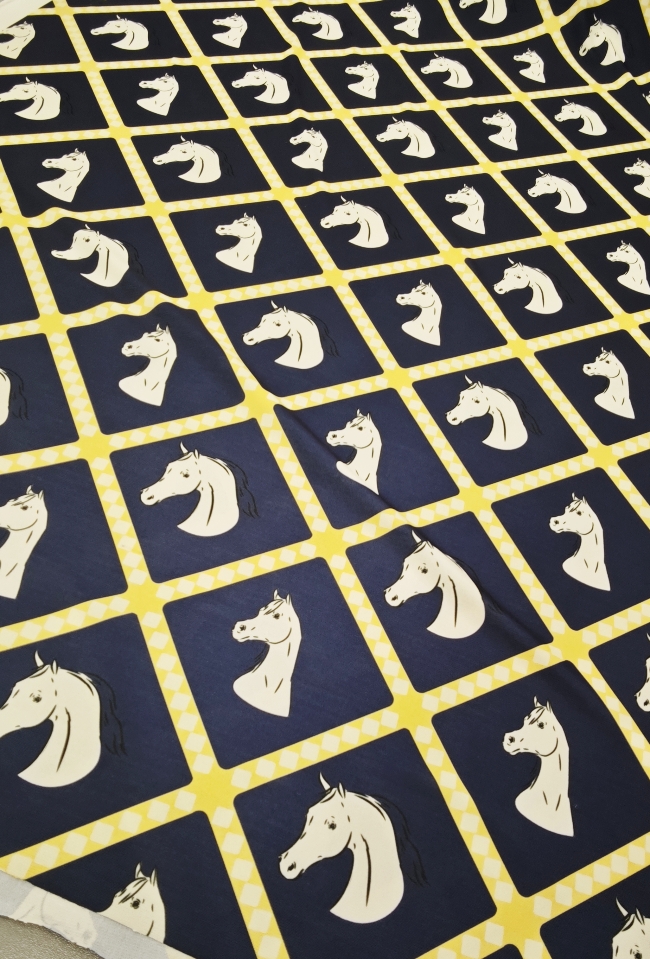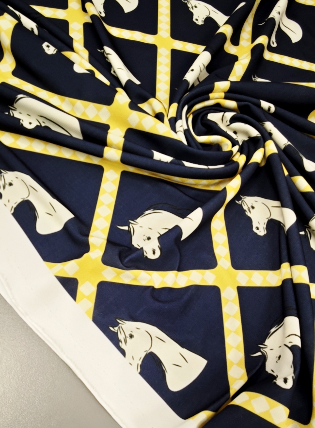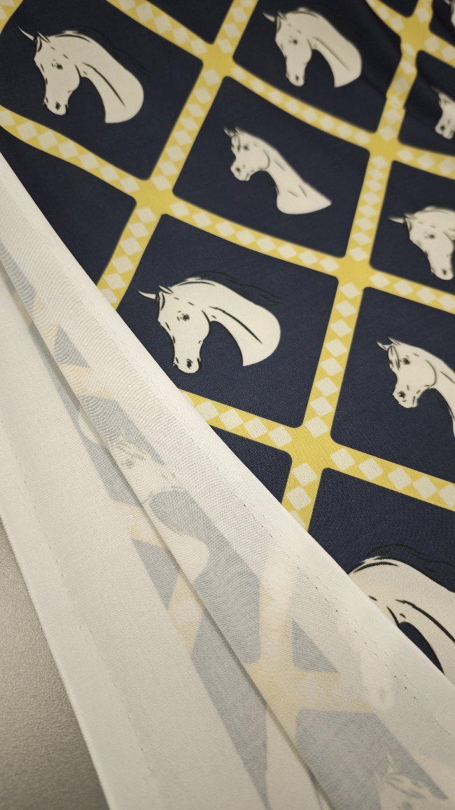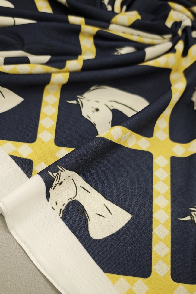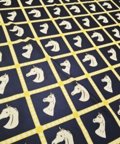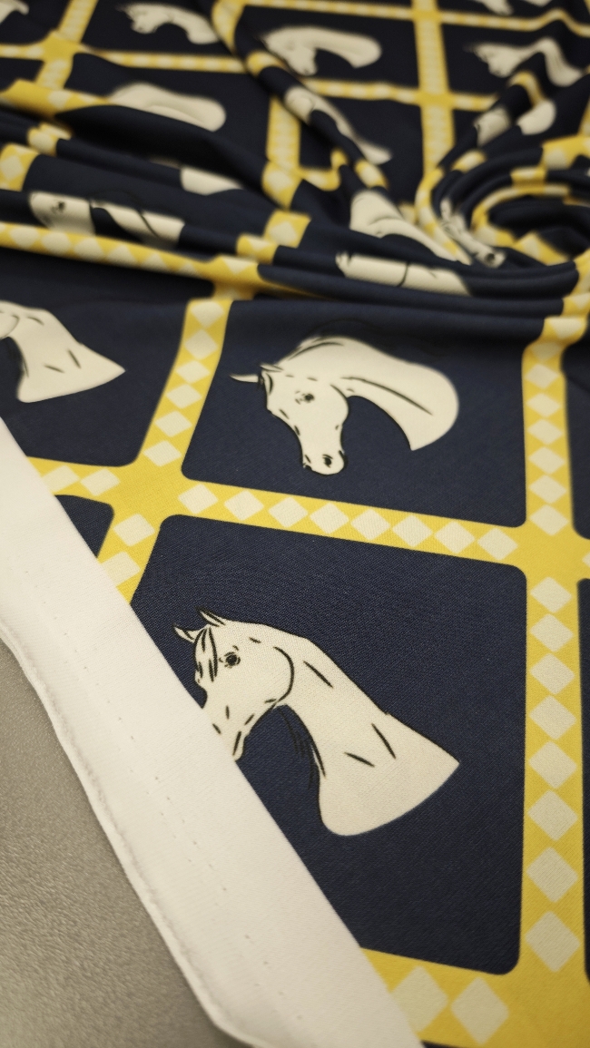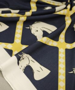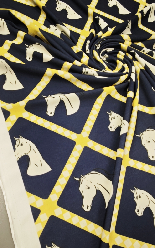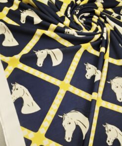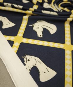 Ako želiš materijal koji se odmah ističe, ova lycra je pravi pogodak. Tamnoplava podloga daje elegantan izgled, dok žuti konjski motiv donosi živost, energiju i privlačan vizualni efekt.