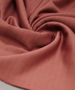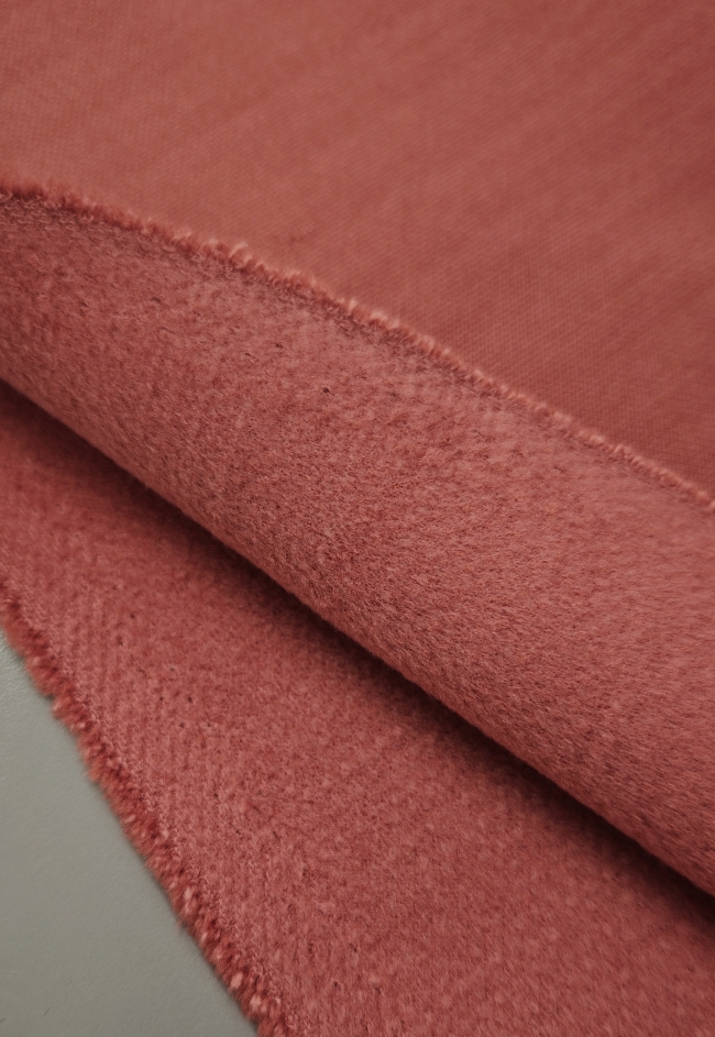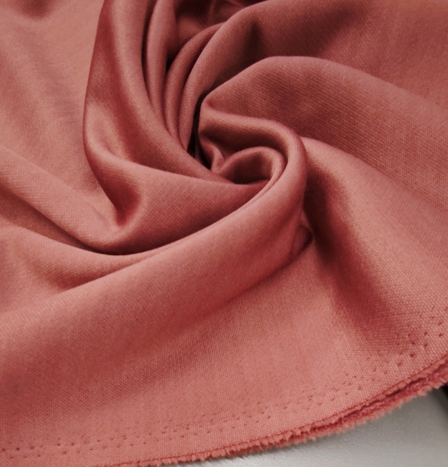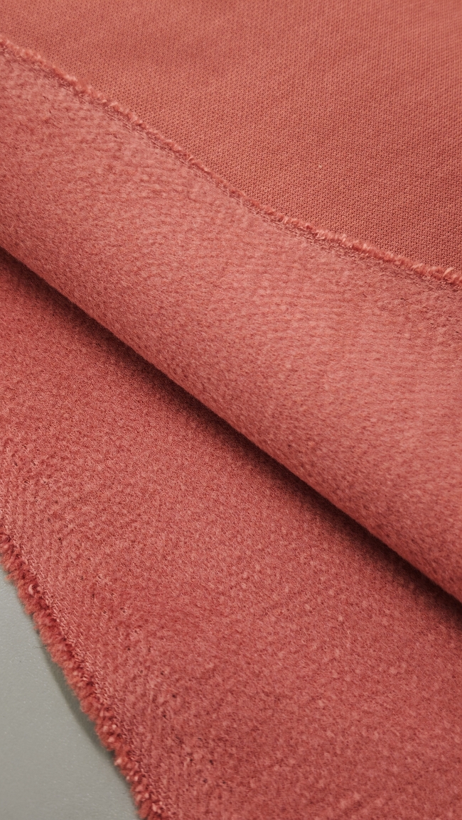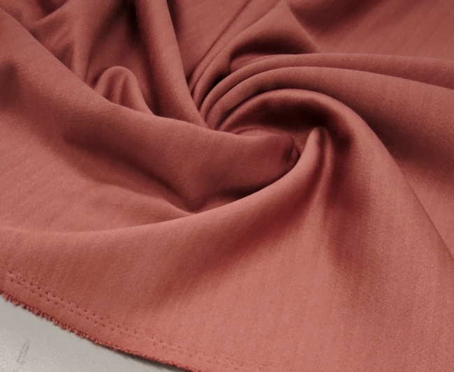 Ova posebna terakotno crvena tkanina savršen je izbor za tople, moderne i udobne jesensko-zimske modele. Prednja strana je glatka i stabilna, dok unutrašnjost donosi mekan, ugodan osjećaj zahvaljujući fino brušenoj teksturi. Blaga elastičnost omogućuje da se odjeća lijepo prilagodi tijelu i ugodno nosi cijeli dan.