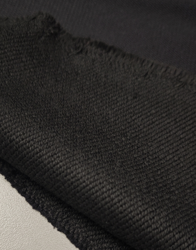 Ova crna felpa oduševljava mekoćom i savršenom elastičnošću – idealan izbor za jakne, trenirke, hlače i sportsku odjeću. Gusta i kvalitetna struktura (305 g/m²) pruža ugodnu toplinu i udobnost pri nošenju, a unutarnja strana je nježno brušena za dodatni osjećaj mekoće. Materijal se lijepo rasteže, ne gubi oblik i lako se održava, što ga čini izvrsnim za svakodnevne i sportske kolekcije.
