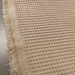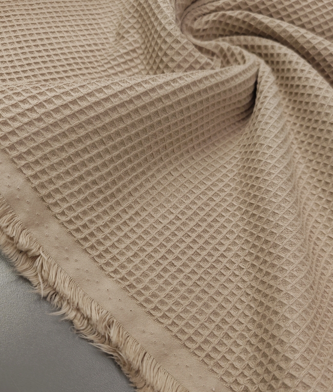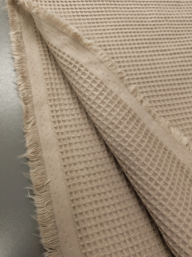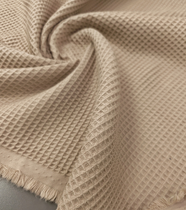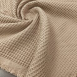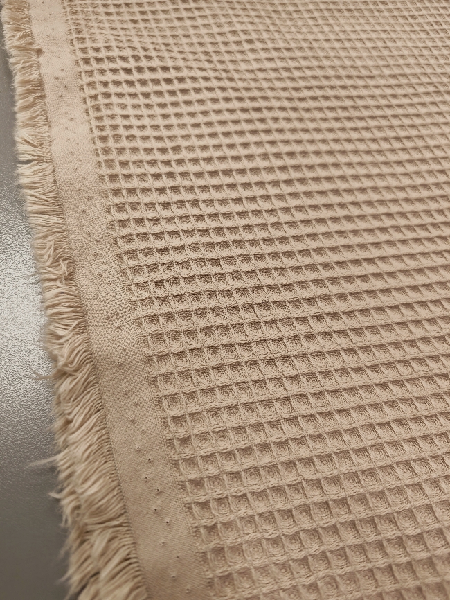 Bež vafl tkanina s izrazitom strukturom i punim izgledom. Mekana, upijajuća i pogodna za ručnike, ogrtače, kuhinjske krpe, dječje dekice i kućne dodatke. Neutralna bež boja izgleda prirodno i lako se kombinira s drugim nijansama.