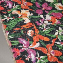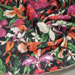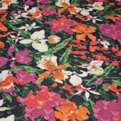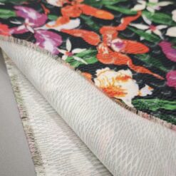 Žakard tkanina s prepoznatljivim egzotičnim cvjetnim uzorkom u nekoliko boja na crnoj podlozi, namijenjena za program odjeće. Materijal je stabilan, dobro drži oblik i ima jasno vidljivu žakard strukturu, što odjeći daje prepoznatljiv izgled. Pogodna za jakne, kapute, suknje, haljine, prsluke i modne komade gdje je uzorak u prvom planu. Tkanina omogućuje čiste linije kroja i vizualno snažan konačni proizvod, pogodan za kolekcije s izrazitim, prepoznatljivim stilom.