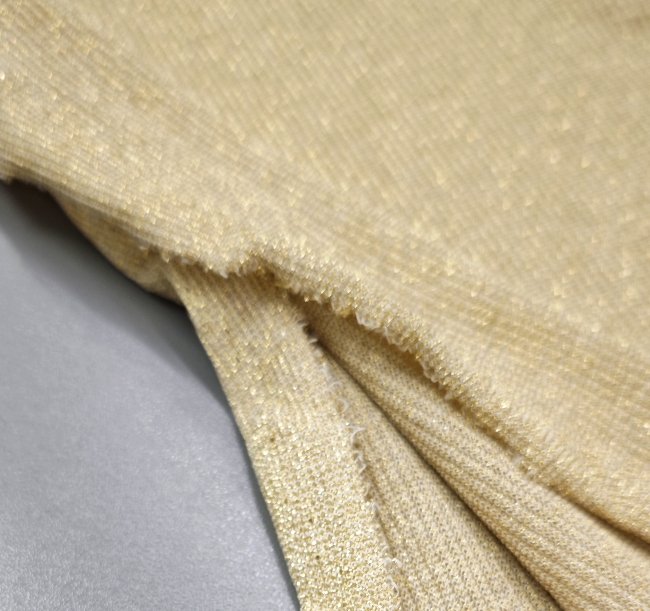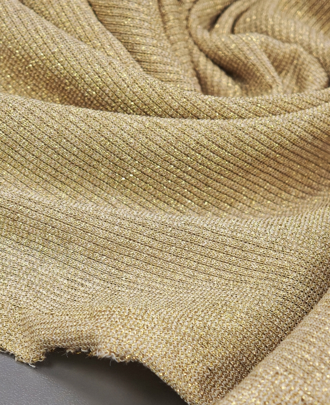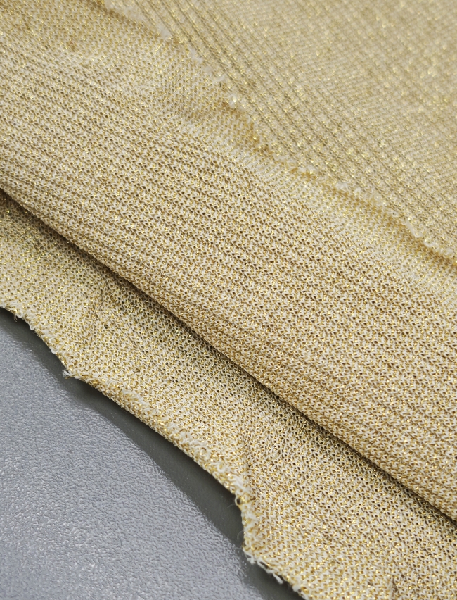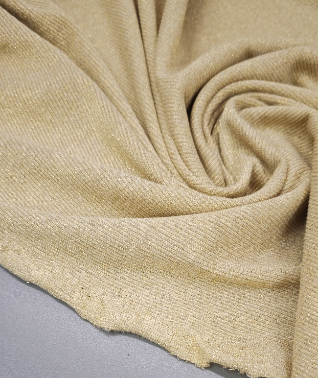 Ovaj lagani i meki lurex jersey donosi savršenu kombinaciju udobnosti, elastičnosti i diskretnog zlatnog sjaja. Idealno za sve koji žele šivati odjeću koja se lijepo prilagođava tijelu i daje poseban, nježan sjaj pri pokretu.