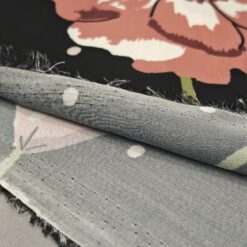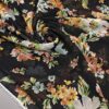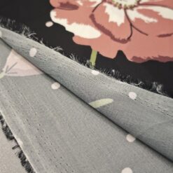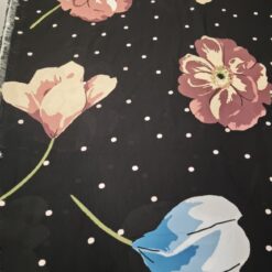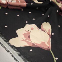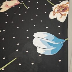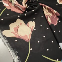 Ovaj žoržet, sa svojom blagom prozirnošću i kontrastom crne podloge, posute tulipanima i sitnim točkicama, donosi moderan i romantičan karakter. Tkanina je lagana, prozračna i nježno pada, pa lijepo prati pokret i stvara elegantan izgled.