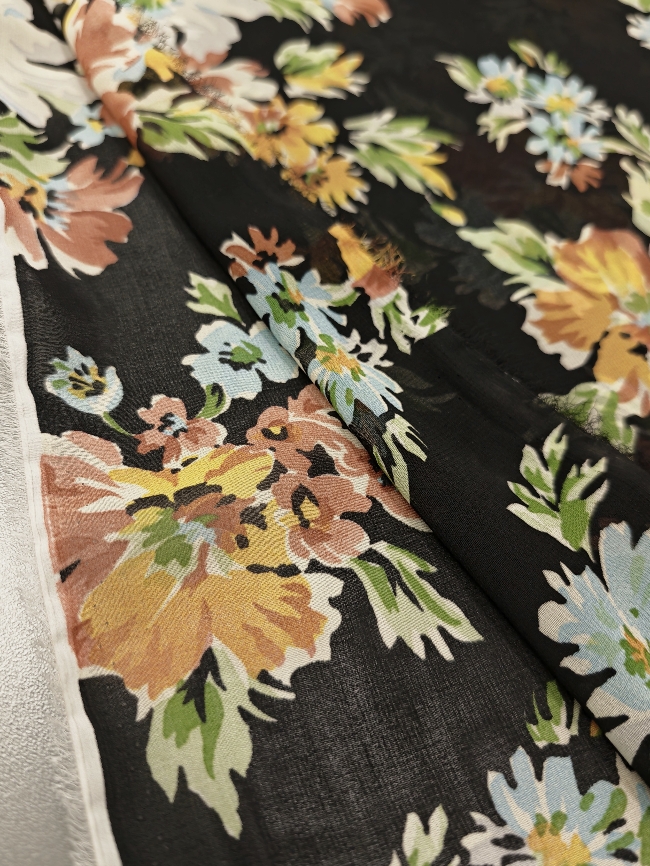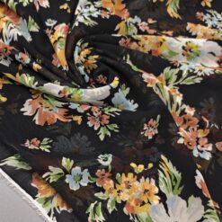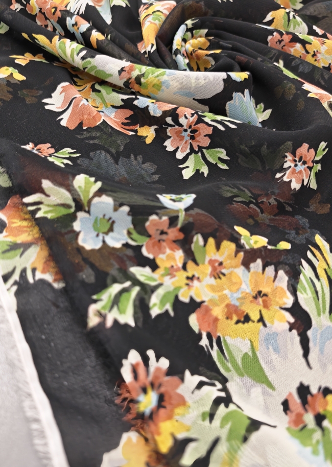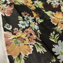 Ovaj prekrasni žoržet u crnoj podlozi sa šarenim cvjetnim motivima donosi pravu dozu elegancije i svježine. Iznimno lagan (67 g/m²) i prozračan materijal savršen je izbor za ljetne bluze, haljine, suknje ili moderne šalove. Nježan pad tkanine omogućuje odjeći da lijepo prati pokrete tijela, a cvjetni uzorak donosi živost i ženstveni šarm.