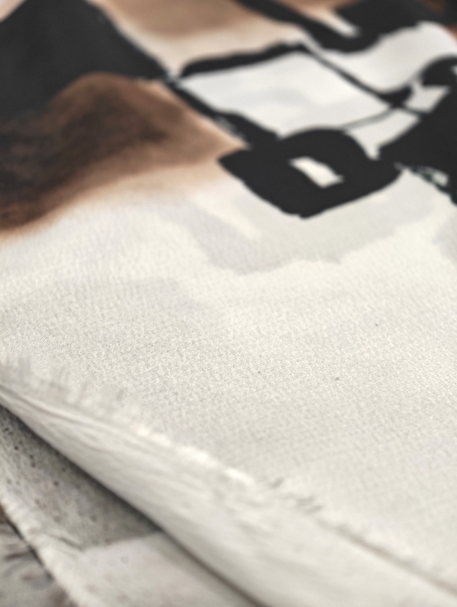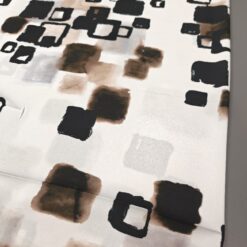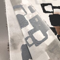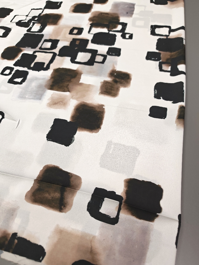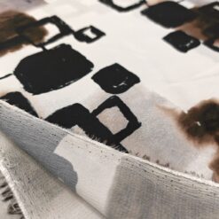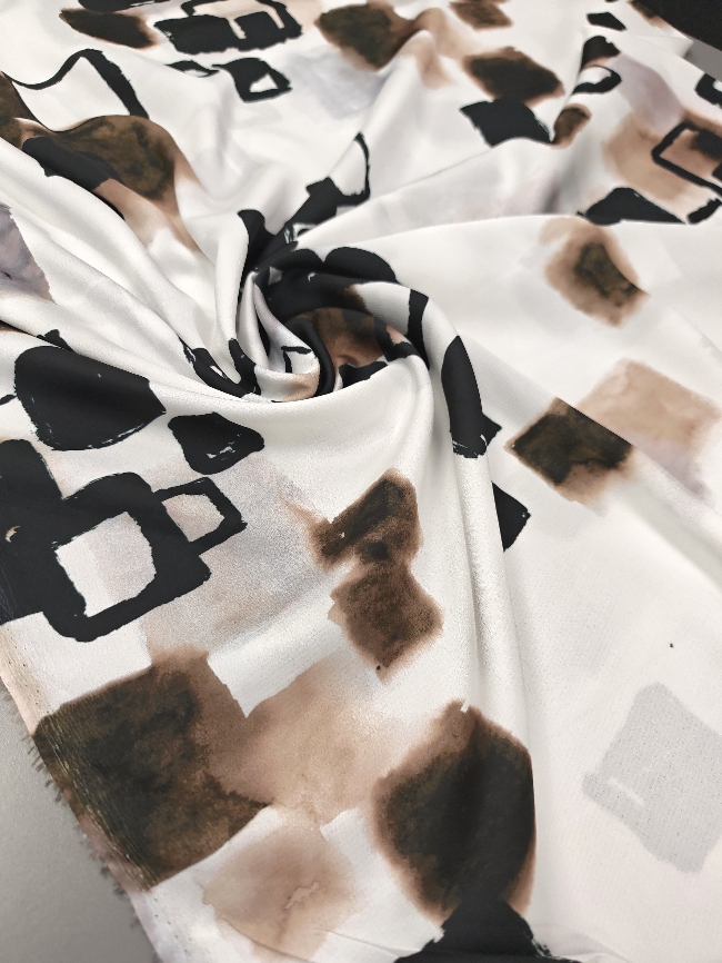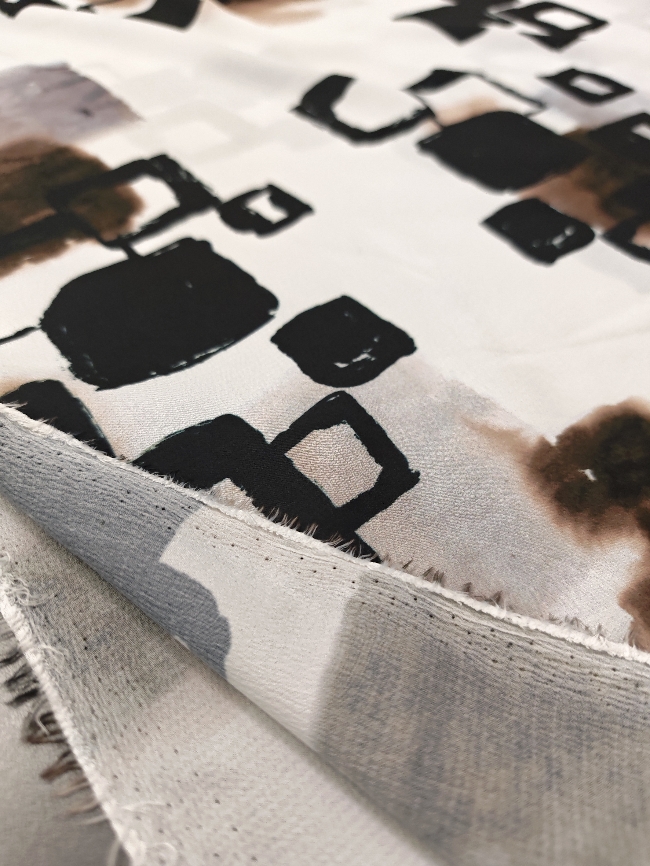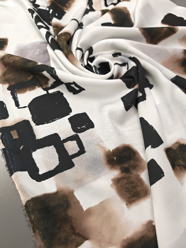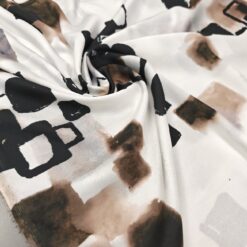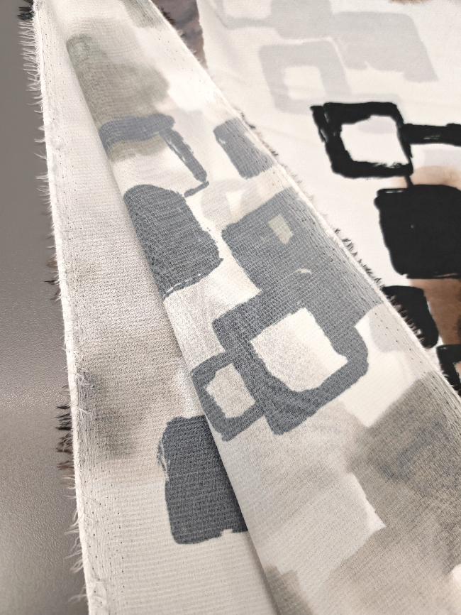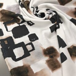 Lagana, prozračna tkanina od žoržeta u nježnom bijelo-krem tonu s izrazitim apstraktnim uzorkom u crnoj i smeđoj boji. Materijal je mekan, lijepo se drapira i izgleda elegantno, pa je prikladan za haljine, bluze, suknje, tunike i lagane šalove. Uzorak dodaje poseban naglasak odjevnom predmetu, a tkanina omogućuje udobno nošenje u toplijim danima i slojevitost u prijelaznim godišnjim dobima. Izvrstan izbor za ženstvene, opuštene krojeve s modernim izgledom.