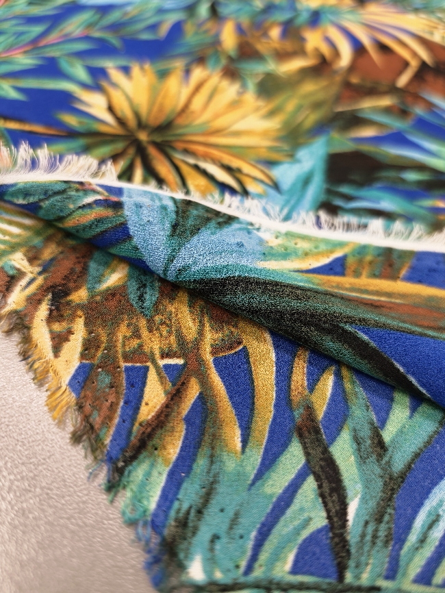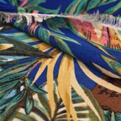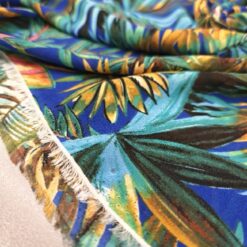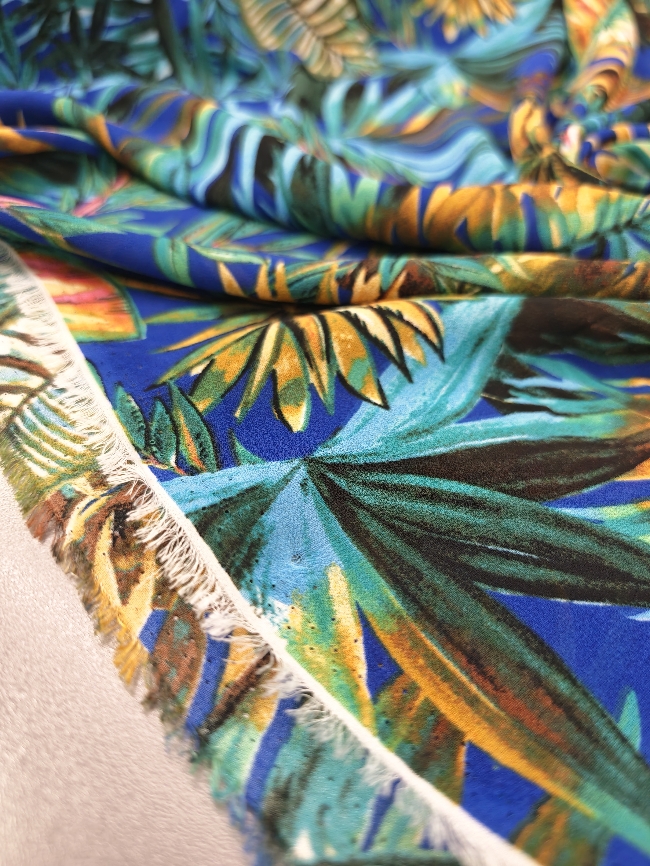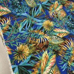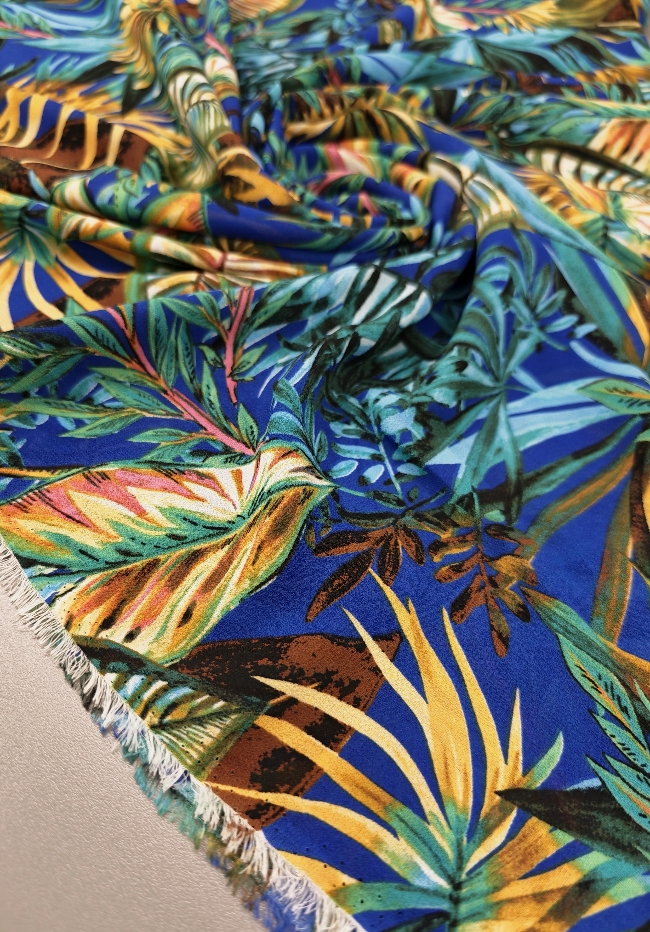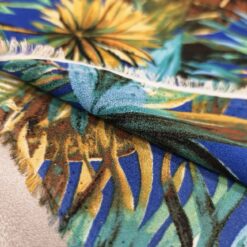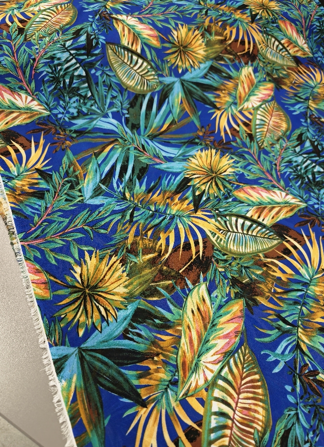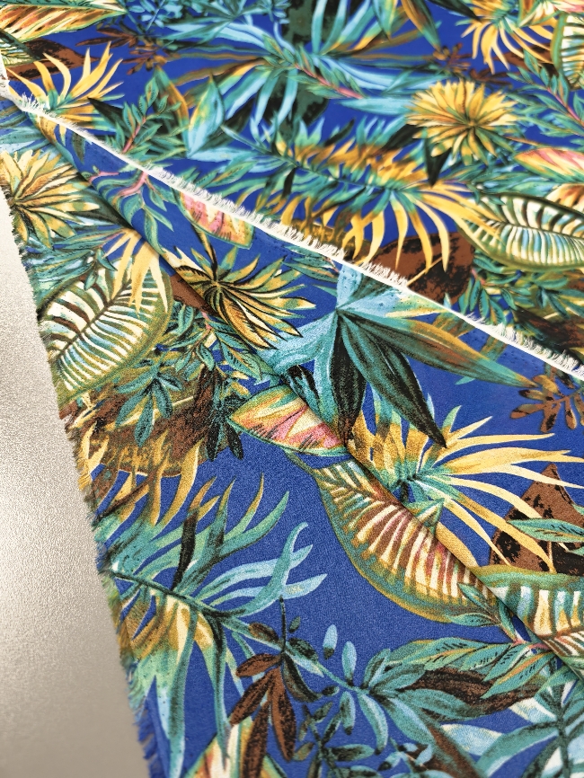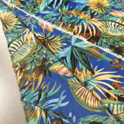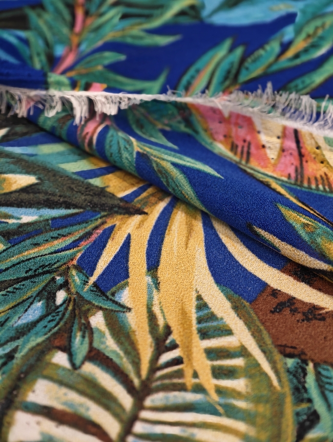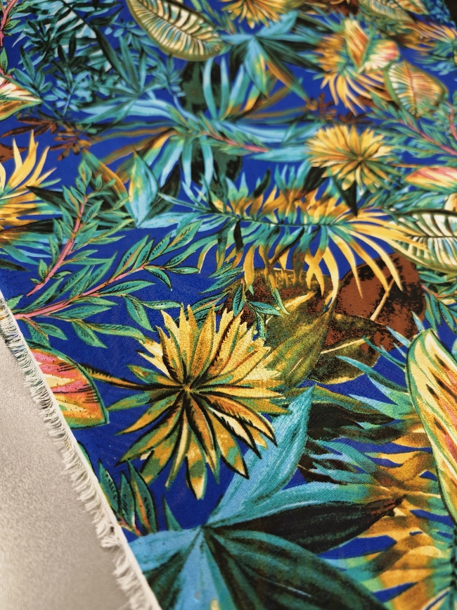 Lagani žoržet s izraženim tropskim uzorkom u kraljevsko plavoj boji. Mekan na dodir, blago teksturiran i lijepo pada, što ga čini idealnim za haljine, bluze i suknje. Motiv tropskog lišća i cvijeća daje materijalu svjež, ljetni izgled koji odmah privlači pažnju. Odličan izbor za lepršavu odjeću koja izgleda efektno i nosi se ugodno.